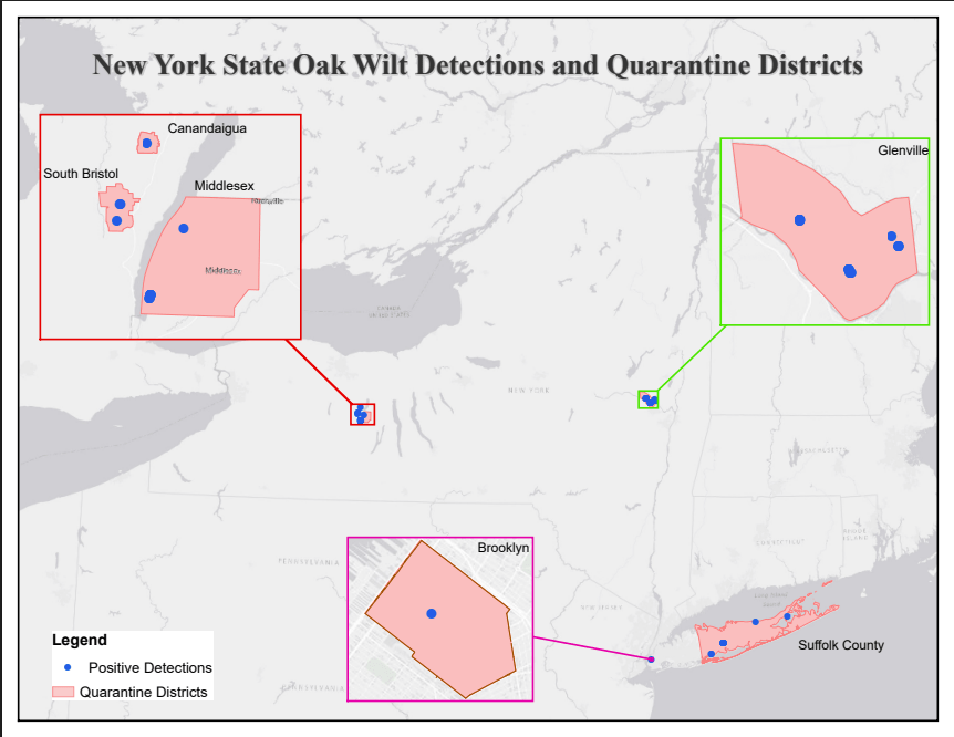 Oak wilt has been detected in several Midwestern states (significantly impacting Michigan and parts of Minnesota), Texas, Pennsylvania and New York, where it was first detected in 2008 near Schenectady. It has since been detected at locations in the Finger Lakes region, Long Island and Brooklyn.