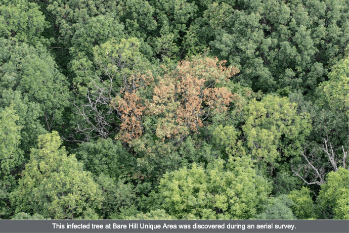 Regardless of the discoloration, the most clear and obvious symptom to look for in Summer is [red] Oak trees that have dropped at least 80% of their leaves, according to Cole. “You can see these trees are still hanging on to a few, but there’s not much there, and the rest eventually will drop,” he said.